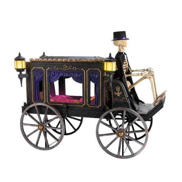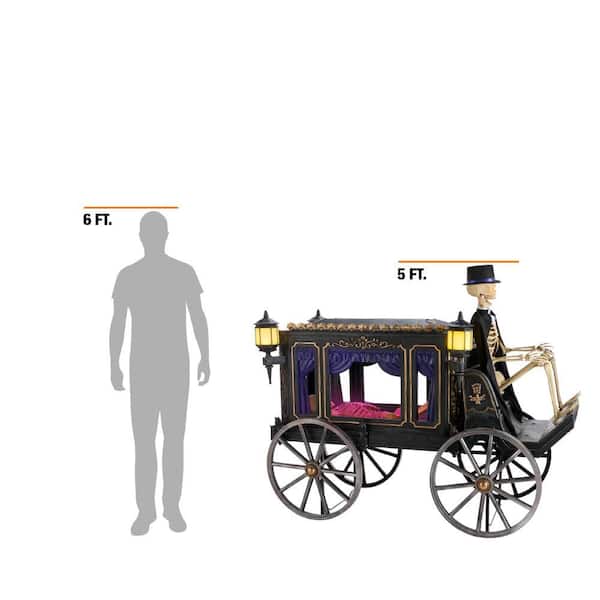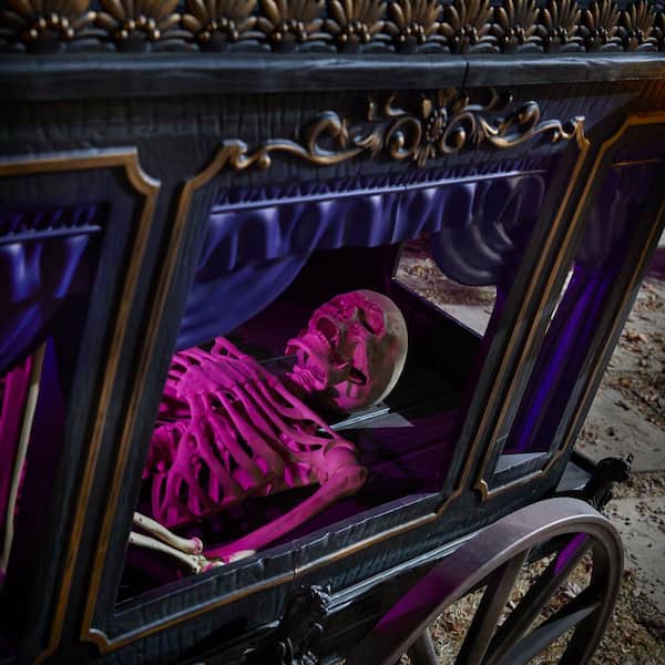 Incluye 3 piezas: 1 coche fúnebre, 1 esqueleto conductor LED animado articulado y 1 esqueleto articulado no electrónico.