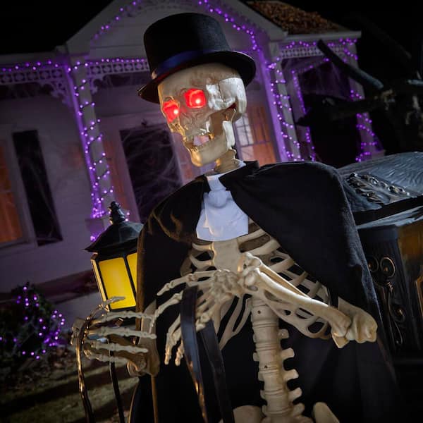 El esqueleto conductor tiene ojos iluminados por LED rojos y mandíbula móvil animada.